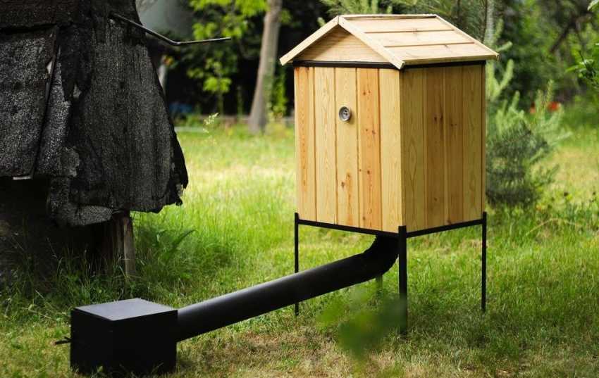 Конструкция для холодного копчения выполняется также в виде домика. При желании коптильню можно интересно декорировать. Устройство подразумевает обустройство основного корпуса коптильни и отдельной топки – соединение выполняется с помощью трубы, размещенной в траншее.