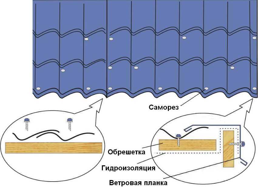 Саморезы крепят в прогиб волны (там, где металлочерепица соприкасается с обрешёткой) строго перпендикулярно обрешётке.