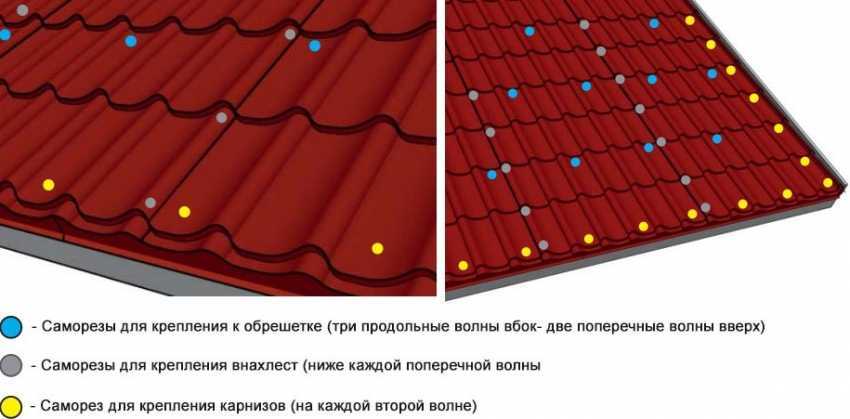 Основные саморезы вкручивают в прогиб волны в шахматном порядке ― так металлочерепица будет более плотно зафиксирована.
