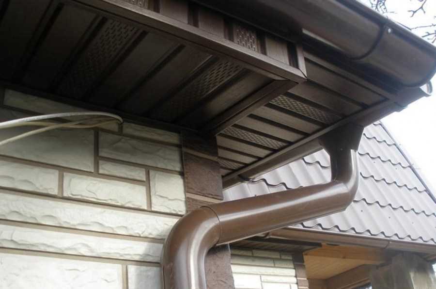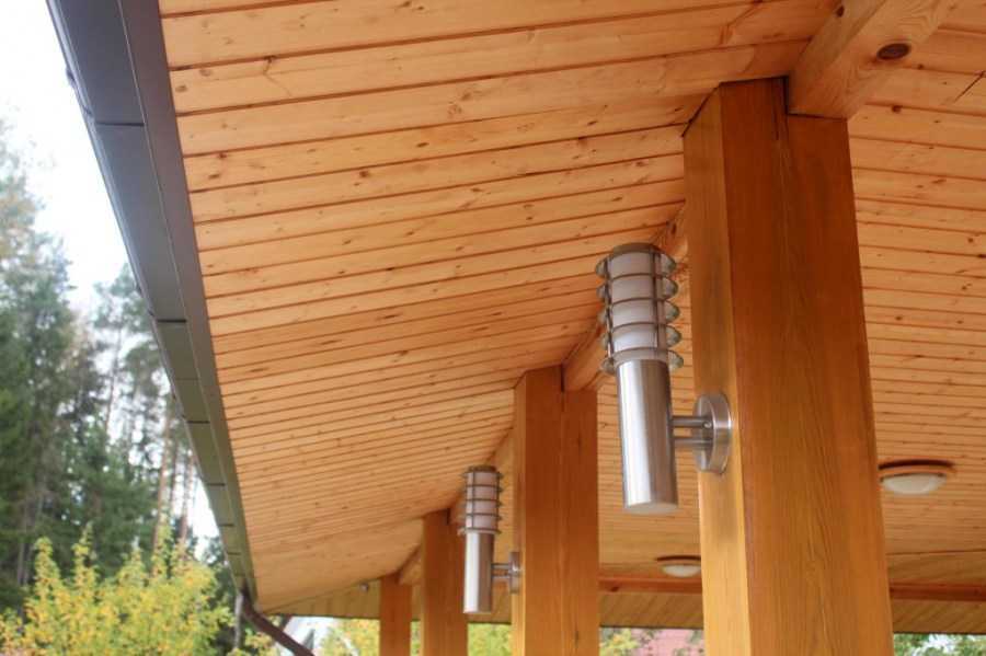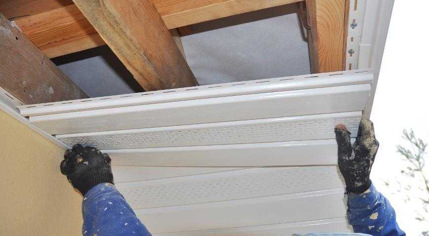 Оптимальные результаты достигаются при использовании софитов – специализированных сплошных, перфорированных и комбинированных панелей нужного размера с удобными системами соединения. При их отсутствии свесы подшиваются сайдингом, профлистом, вагонкой и другими листовыми и погонажными материалами на основе пластика, дерева или металла, выдерживающими ветровую нагрузку и атмосферные воздействия.