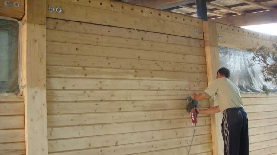 Оптимально проводить такие работы до монтажа окон и дверей, т.к. процесс шлифовки очень пыльный. По этой же причине работники должны использовать респираторы и защитные очки. Обработке подвергается только сухая поверхность пиломатериала, а также торцы бруса. В этих целях используют специальные шлифовальные машинки, а также шкурку с различной зернистостью, которую подбирают исходя из текущего состояния поверхности стены.