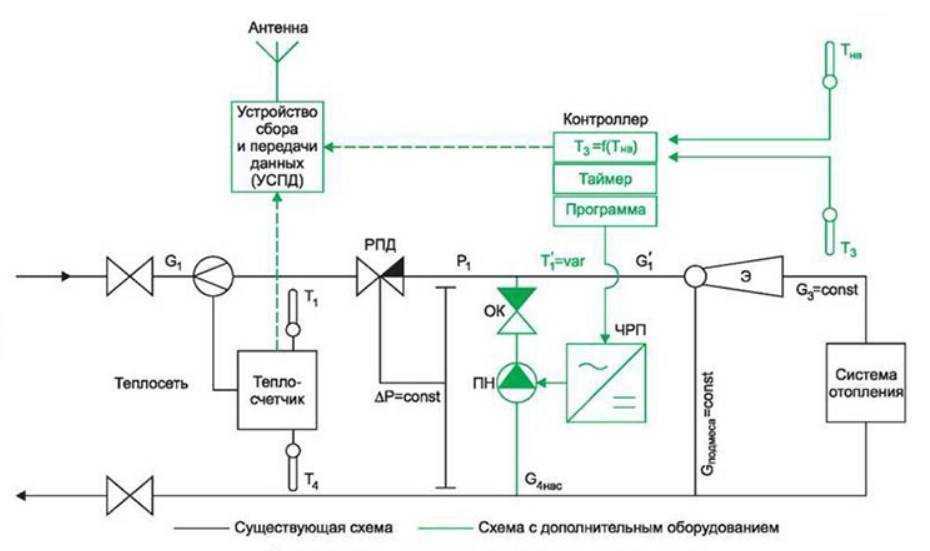 Особенно важным такое решение становится в однотрубных системах, где имеется нагрузка в виде ГВС, дестабилизирующая расход горячей воды и создающая существенные колебания во время активного водоразбора (утренние и вечерние часы, праздничные и выходные дни). При этом данная схема не способна исправить ситуацию при изменениях температуры теплоносителя в магистральной линии, что является её недостатком, хоть и не слишком существенным. Падение температуры теплоносителя в питающих трубопроводах означает аварию на ТЭЦ или ином пункте нагрева, а это случается редко.