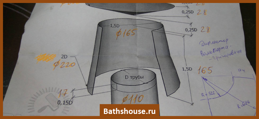 На основании полученного значения диаметра воздуховода определяются все расчетные величины элементов будущего приспособления. Чтобы не допустить ошибок, рационально сначала собрать макет дефлектора из картона. Для этого на бумажные листы наносят разверстку каждой из деталей устройства, а вырезав, собирают модель. Если расчеты размеров дефлектора ЦАГИ выполнены верно, то приступают к изготовлению прибора.