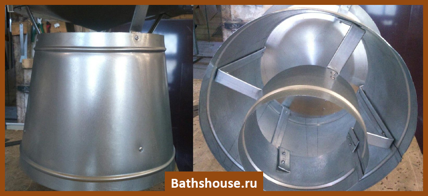 - колпак — аккуратно сворачивают заготовку в конус и скрепляют. С внутренней стороны (примерно 5 мм от края) просверлить несколько отверстий и прикрепить полоски из оцинкованной стали (4 штуки длиной 20 и шириной 5 см), последним придать П-образную форму.