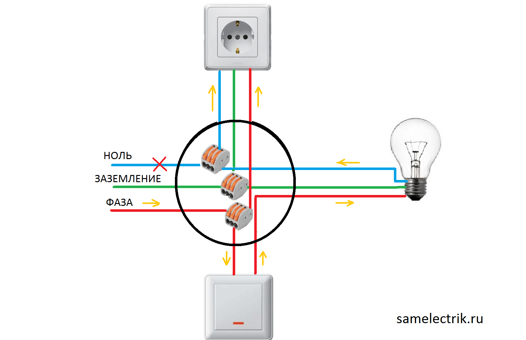 Для того, чтобы Вы поняли причину неисправности, предоставим наглядную схему подключения розетка-выключатель-лампочка: