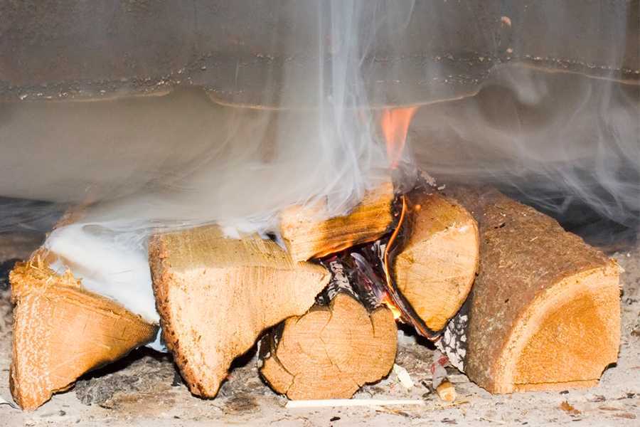 Такой состав используют в небольших количествах, сжигая вместе с топливом. На тонну дров достаточно всего 200 г средства. Для камина такой способ очистки не подойдет. Пары токсичны и не должны проникать в помещение. Поэтому дверца топки должна быть плотно закрыта.