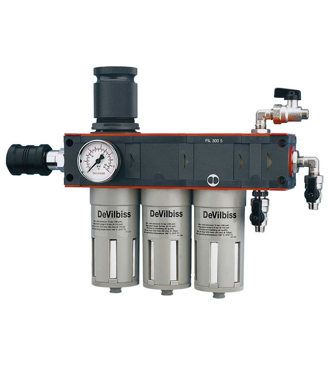 | Фильтр — влагомаслоотделитель DVFR-2Двухступенчатый фильтр с регулятором давления DeVilbiss DVFR-2 обладает высокой степенью очистки воздуха до 0,01 мкм. Пропускная способность в 3500 л/мин позволяет использовать его для работы на небольшом производстве. Наличие трех выходных штуцеров с регулировочными шаровыми кранами дает возможность подключать до трех устройств одновременно. Фильтр изготовлен из стойких к воздействию растворителей материалов. Современная высокотехнологичная конструкция с подвижной мембраной быстро и гибко реагирует на подачу воздуха и обеспечивает точный контроль.