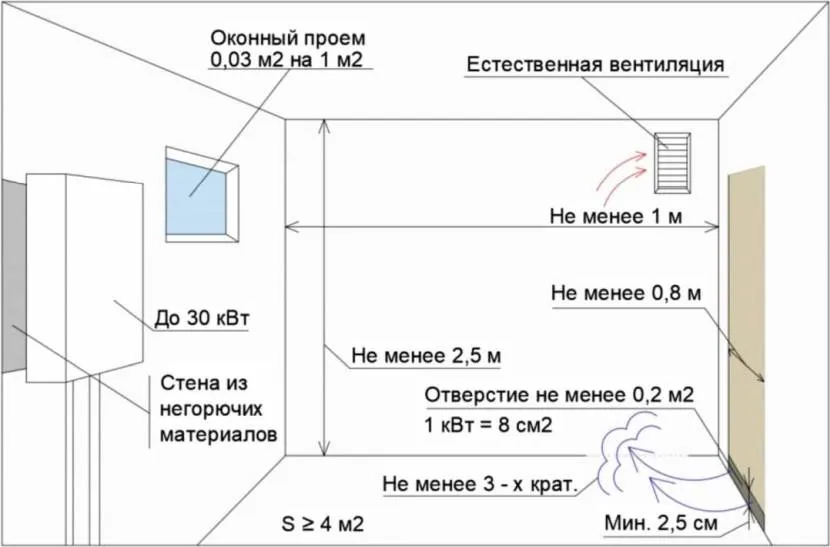 Другими словами: если в котельной высота потолка 2.5 метра, то площадь для установки оборудования мощностью свыше 60 кВт должна составлять не менее 6 квадратных метров. То есть 2*3 метра и с высотой потолка 2.5 метра.