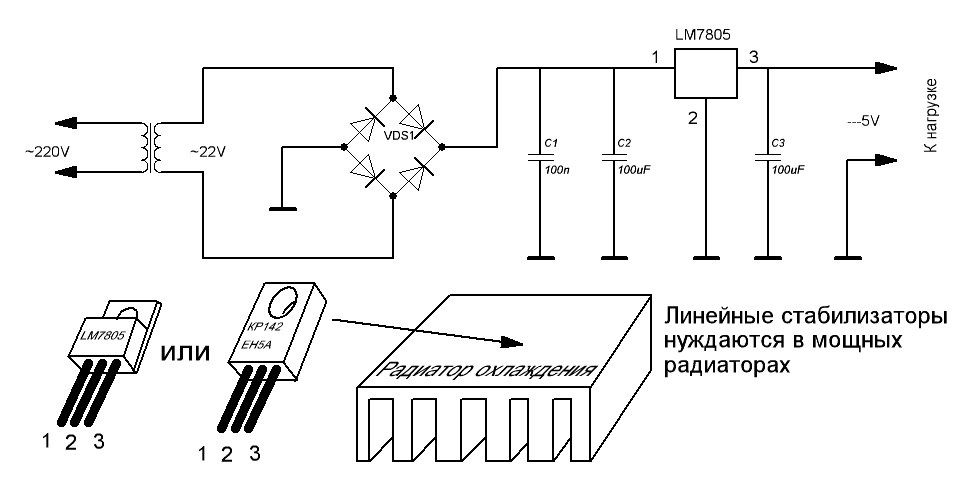 Проще схем наверное не бывает: сам стабилизатор и два конденсатора. Чтобы стабилизатор работал правильно (нормально стабилизировал и не генерировал пульсации) стабилизатора на вход и выход необходимо подключить конденсаторы. Причем их номиналы не должны быть меньше 0,33 мкФ и 0,1 мкФ соответственно.