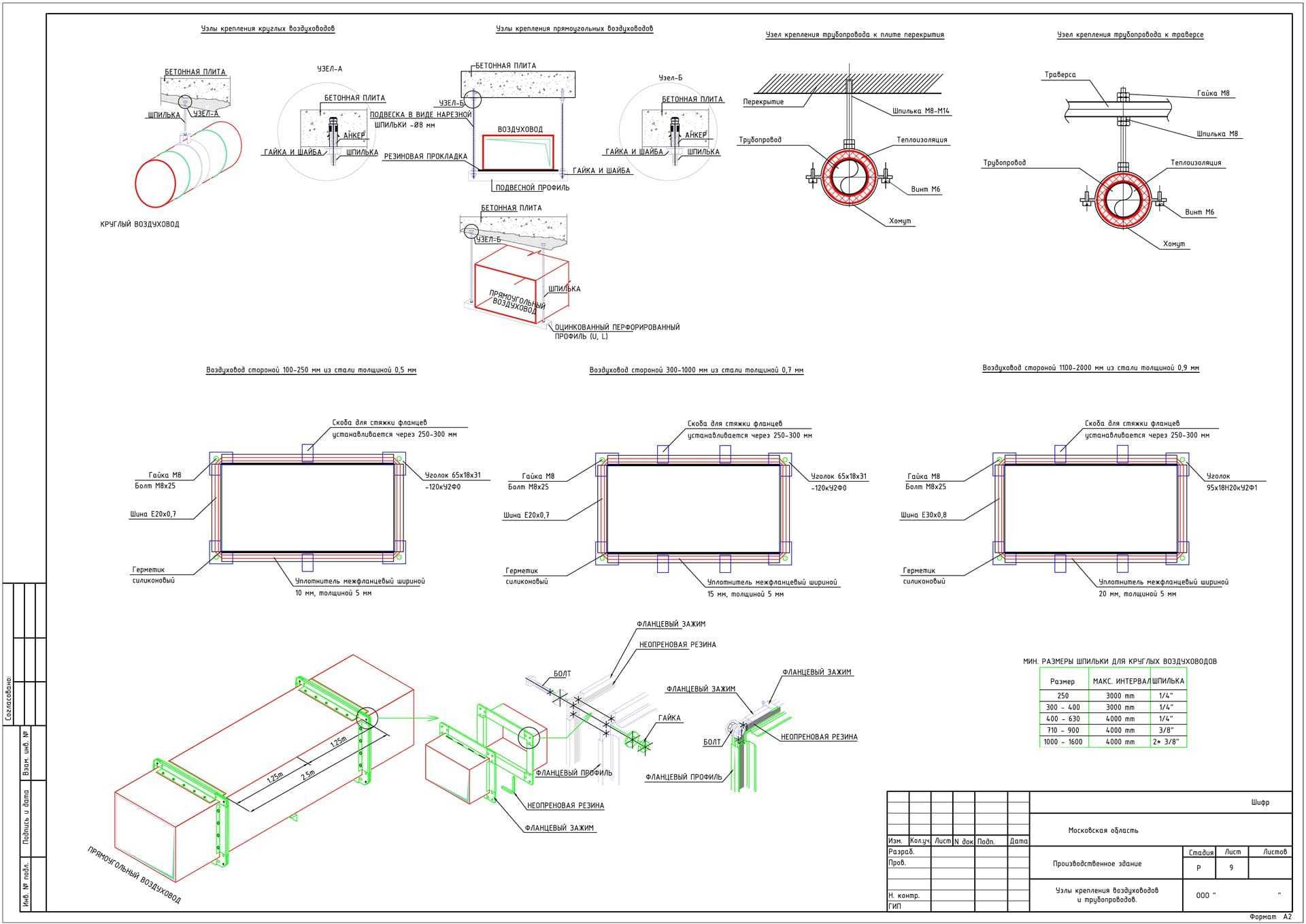 Стандартные элементы любого проекта. Воздуховоды разного размера и конфигурации крепятся по-разному. Крепежные элементы дополнительно заказываются монтажной организацией и должны строго соответствовать указанным в проекте требованиям.